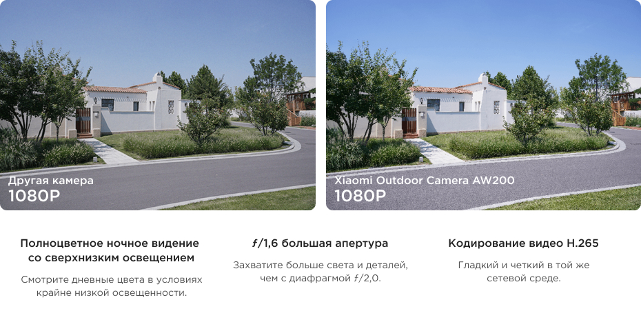 Xiaomi Outdoor Camera AW200 имеет высокое разрешение 1920x1080p для гарантированного качества изображения, цифровой зум и увеличение деталей. Большая апертура F1.6 также помогает увеличить поглощение света и повысить прозрачность изображения.