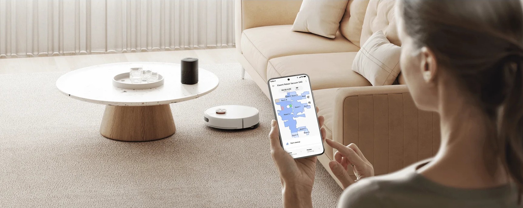 Управление полностью сосредоточено в смартфоне: можно задавать расписание, ограничивать зоны уборки, управлять картами комнат и регулировать подачу воды. Поддерживается голосовое управление через популярных ассистентов, что делает использование ещё комфортнее.