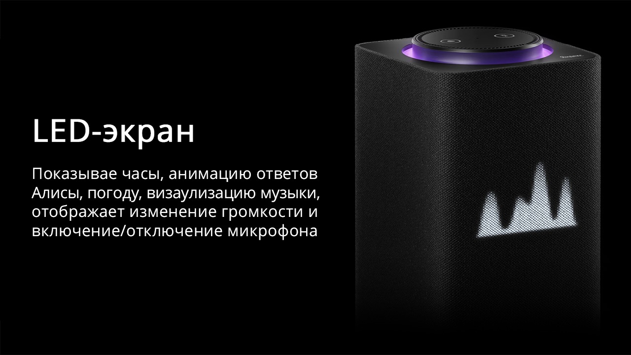Яндекс.Станция Макс выпущена на смену оригинальной Яндекс.Станции 2018 года. Дизайн умной колонки практически не изменился, зато возможности соответствуют самым смелым ожиданиям. Улучшенное звучание, оптимальный набор интерфейсов, более громкий и качественный звук и, конечно же, главное новшество – дисплей. Благодаря семи микрофонам разной чувствительности колонка определяет команды даже во время воспроизведения на высокой громкости. Как и прежде, микрофоны можно отключить физически отдельной кнопкой.