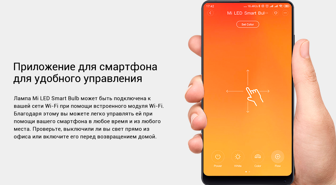 Подключение по Wi-Fi позволяет управлять освещением через приложение Xiaomi Home: менять яркость, цвет и режимы освещения.